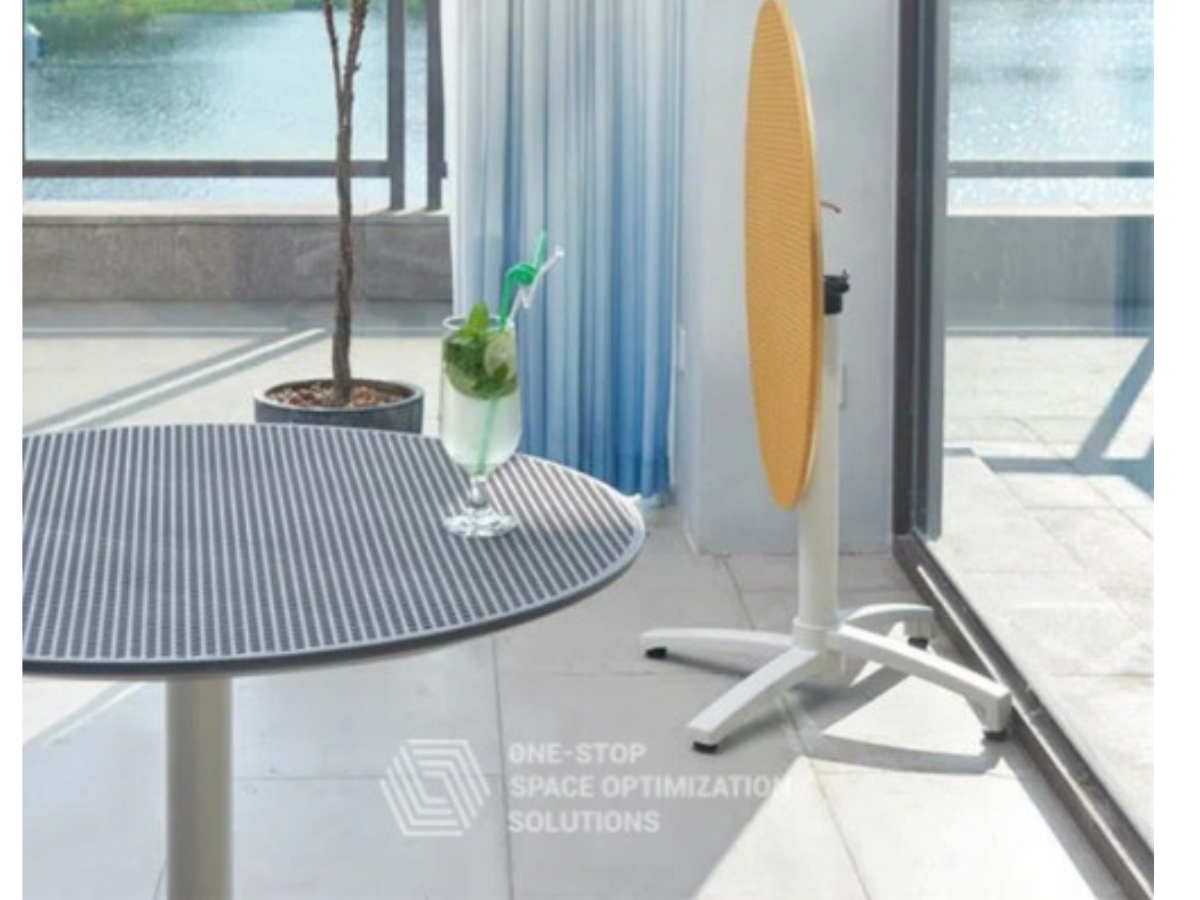 Bàn ăn/ bàn cafe tròn dùng cho ngoài trời và trong nhà. Mặt trên bằng nhựa đúc có thể gập lại cùng hệ chân kim loại có thể xếp gọn, một tính năng hoàn hảo khi sử dụng cho nhà hàng - cafe.