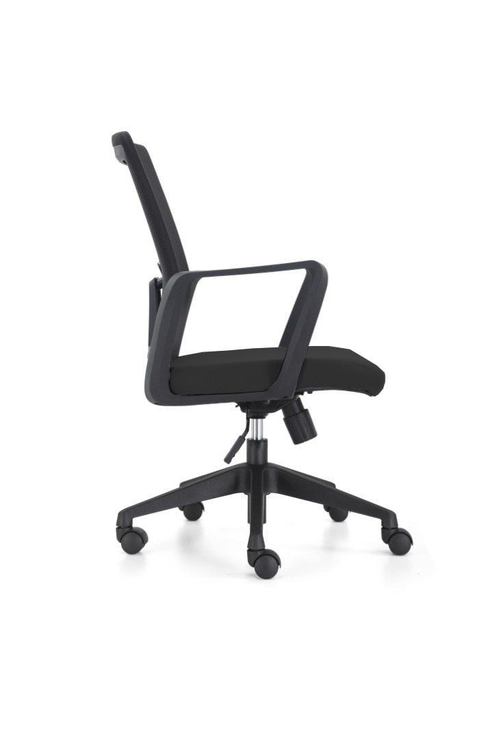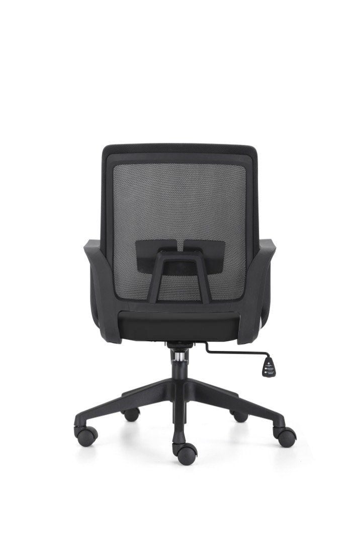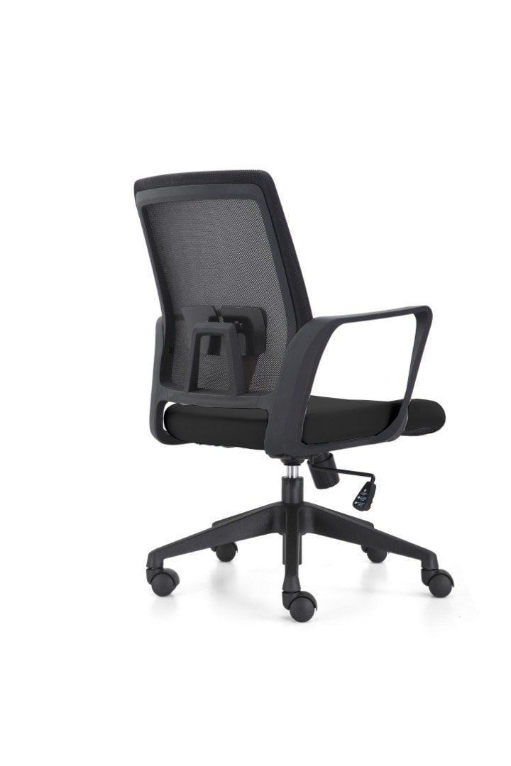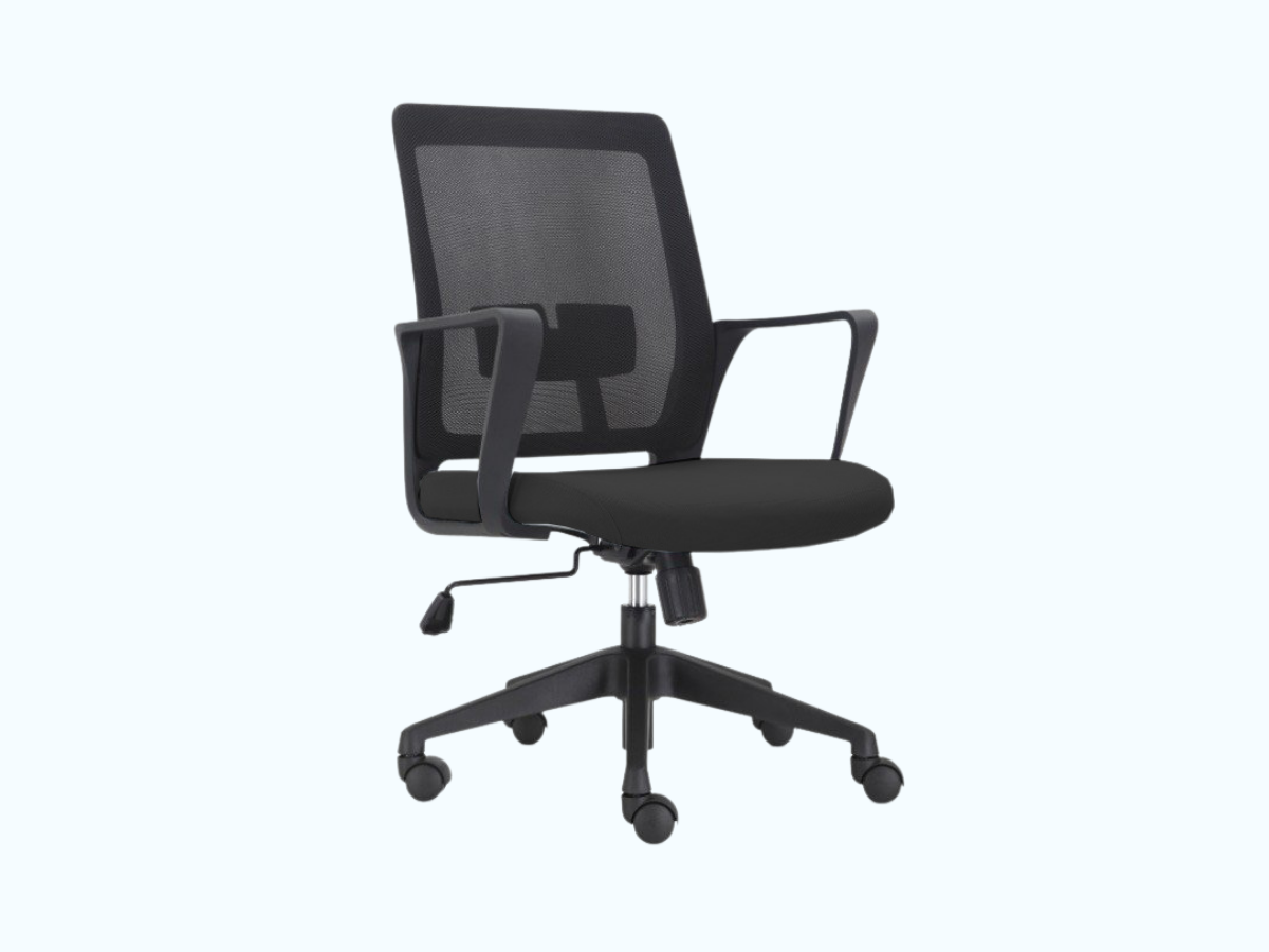 Chất liệu : Ghế lưng trung, lưng lưới, nệm bọc vải, tay nhựa cố định, ghế có thể nâng hạ, chân nhựa xoay.