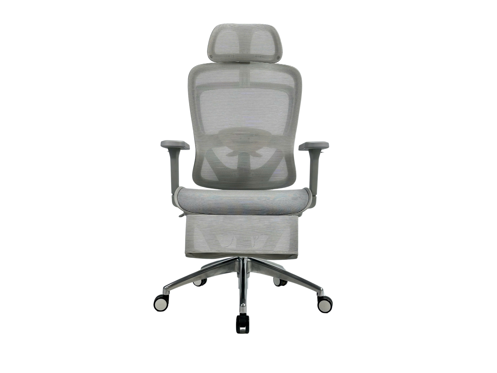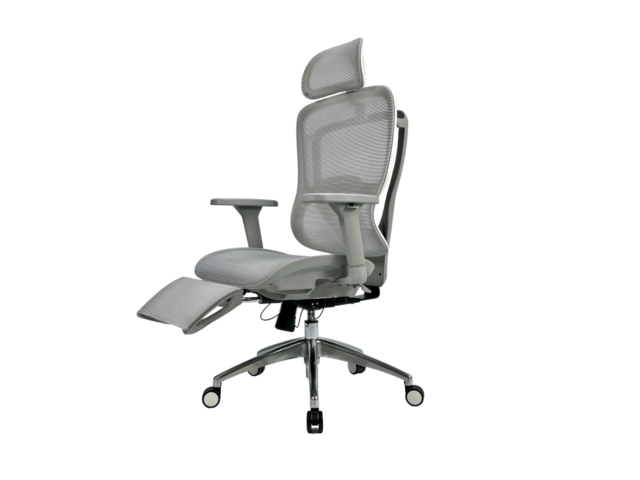 Lưng lưới, nệm lưới, tựa đầu lưới, chân nhôm xoay, tay điều chỉnh, giá đỡ chân