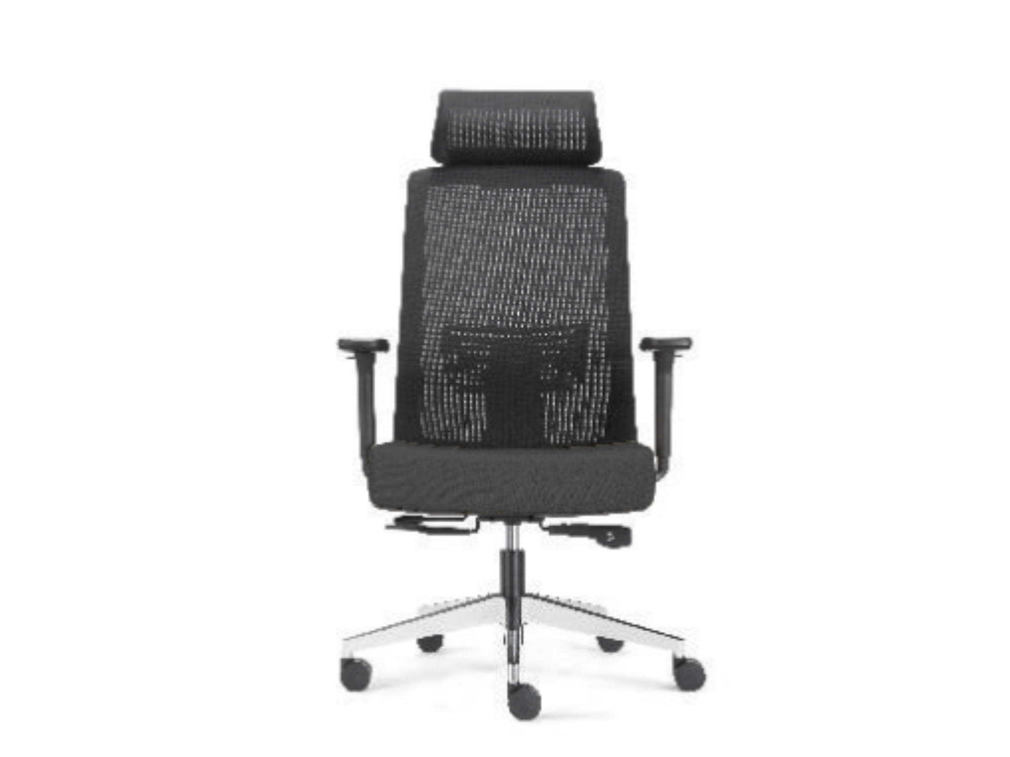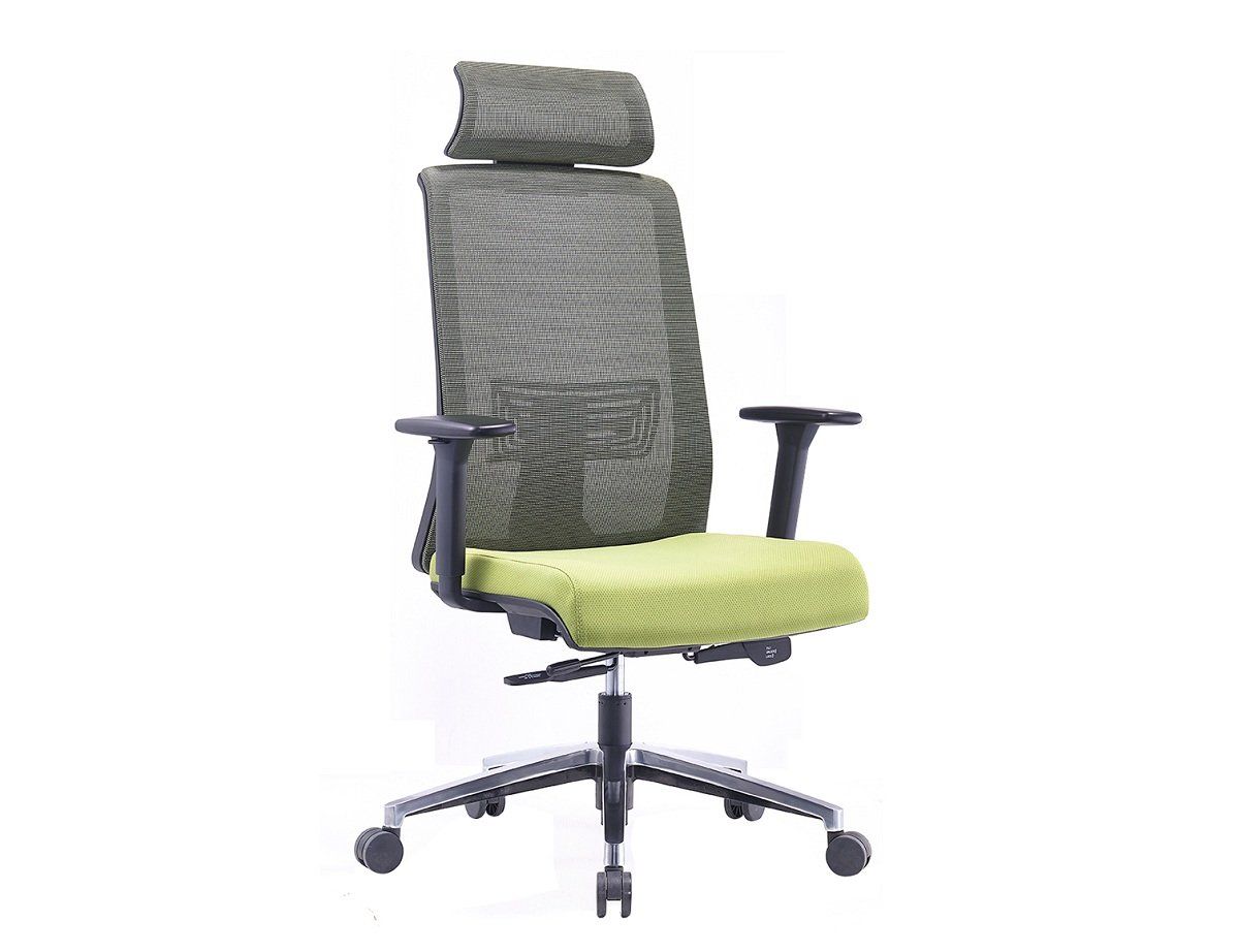 Lưng lưới cao cấp, nệm vải, chân nhôm xoay, tay ốp PU điều chỉnh.